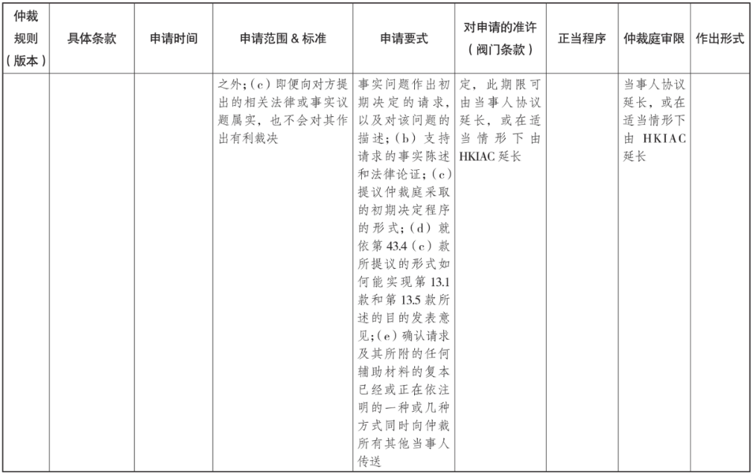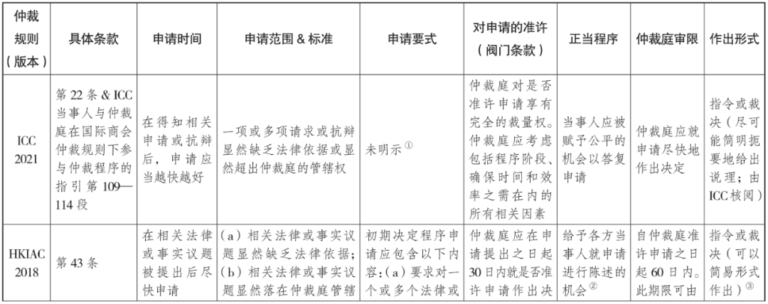 之所以选择SIAC、ICSID、ICC、斯德哥尔摩商会仲裁院(Arbitration Institute of the Stockholm Chamber of Commerce,以下简称SCC)和香港国际仲裁中心(Hong Kong International Arbitration Center,以下简称HKIAC)仲裁规则,一方面是因为这些仲裁机构极具国际影响力,机构发源地为国际仲裁中心;另一方面则是因为这些机构均已将早期驳回程序加以明确,具有一定的典型性和创新性。仲裁早期驳回程序大致涉及申请时间、申请范围/标准、申请要式、阀门条款(gatekeeping mechanism)/对申请的准许、正当程序、仲裁庭审限和作出形式。具体内容详见下表: