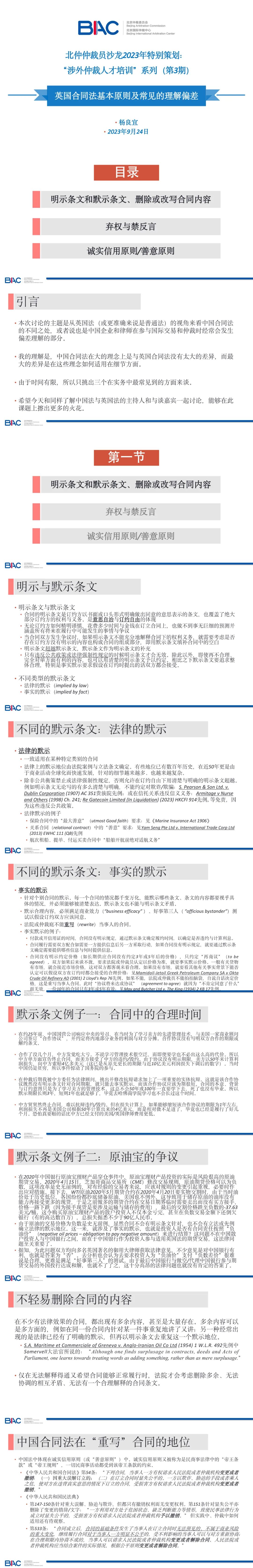 9月24日,最高人民法院国际商事专家委员会委员、北京仲裁委员会/北京国际仲裁中心(以下称北仲)仲裁员杨良宜先生以“英国合同法基本原则及常见的理解偏差”为主题,为北仲仲裁员沙龙2023年特别策划:“涉外仲裁人才培训”系列沙龙开展专题讲座。经杨良宜先生授权,北仲特发布培训课件,以飨读者。