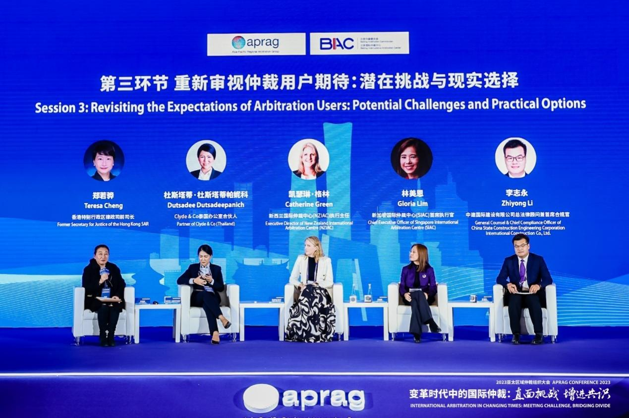 第三环节由香港特别行政区律政司前司长郑若骅主持,Clyde & Co泰国办公室合伙人Dutsadee Dutsadeepanich、新西兰国际仲裁中心(NZIAC)执行主任Catherine Green、新加坡国际仲裁中心(SIAC)首席执行官Gloria Lim、中建国际建设有限公司总法律顾问兼首席合规官李志永发言。本环节采用问答形式,深入探讨了仲裁用户的期望与仲裁实践的挑战。