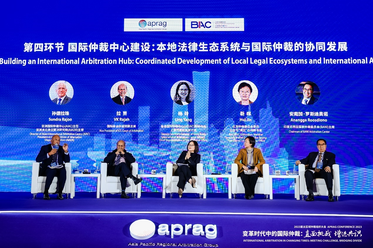 第四环节由亚洲国际仲裁中心(AIAC)主任、亚洲多元争议解决研究院(AIADR)主席Datuk Sundra Rajoo主持,国际商会仲裁院副主席VK Rajah、香港国际仲裁中心(HKIAC)副秘书长及上海代表处首席代表杨玲、北京仲裁委员会委员及北京市“两区”办特聘专家靳晖、印度尼西亚国家仲裁委员会(BANI)主席Anangga W. Roosdiono发言。