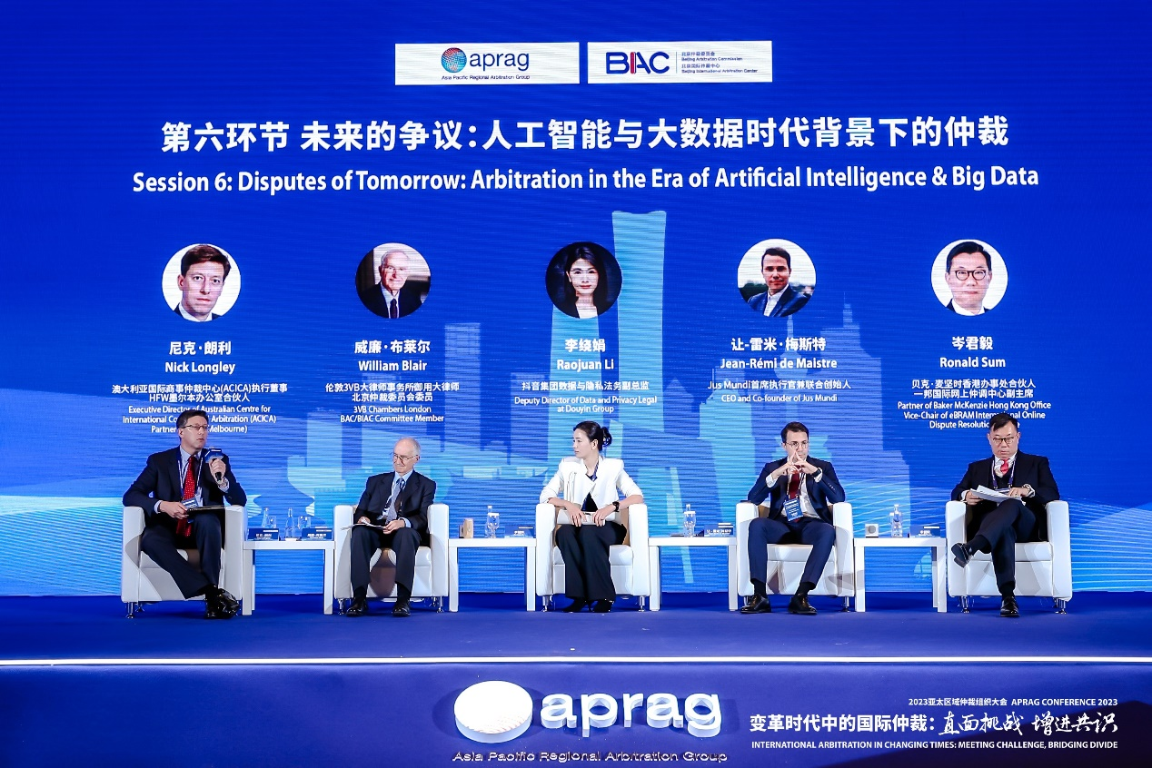 第六环节由澳大利亚国际商事仲裁中心 (ACICA)执行董事及HFW墨尔本办公室合伙人Nick Longley主持,北京仲裁委员会委员及伦敦3VB大律师事务所御用大律师William Blair、抖音集团数据与隐私法务副总监李绕娟、Jus Mundi 首席执行官兼联合创始人Jean-Rémi de Maistre、贝克·麦坚时香港办事处合伙人及一邦国际网上仲调中心副主席岑君毅发言。