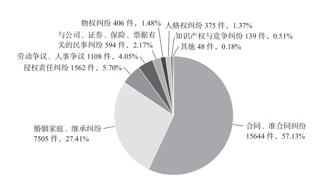 在威科先行数据库中,2022年全年公开的以调解结案的裁判文书共有28,337份。其中,民事案由的调解书有28,107份,包括合同、准合同纠纷,婚姻家庭、继承纠纷,侵权责任纠纷,劳动争议、人事争议,公司、证券、保险、票据等有关的民事纠纷,物权纠纷等。具体占比如下: