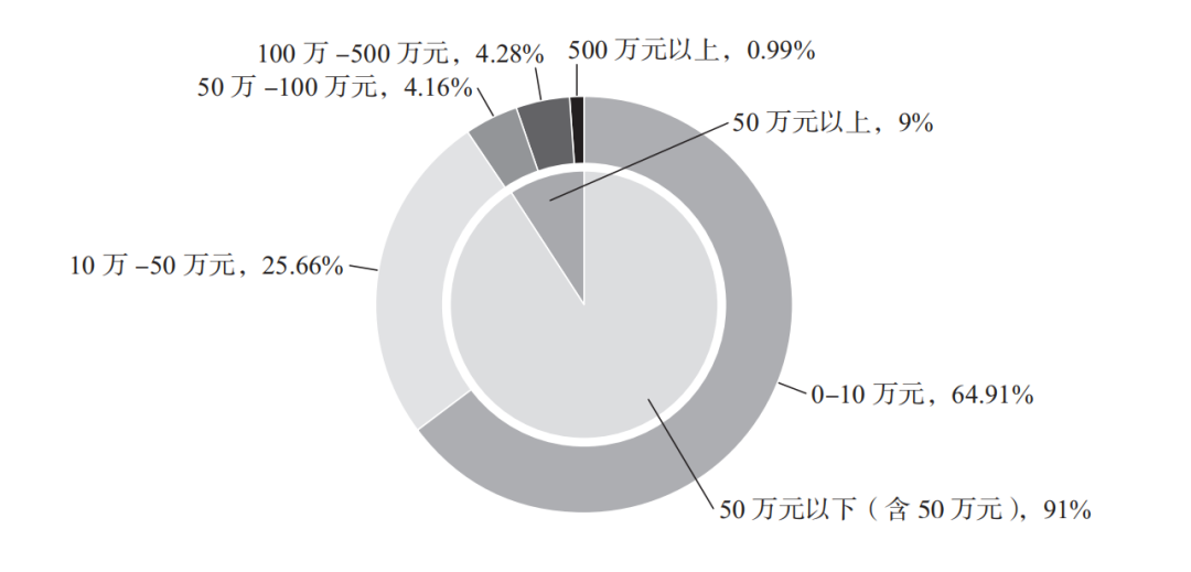 在公开的以调解结案的裁判文书中,90%以上都是争议标的额在50万元以下的争议,具体案件的标的额情况如下:
